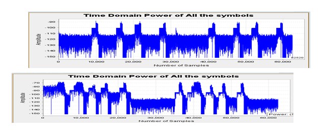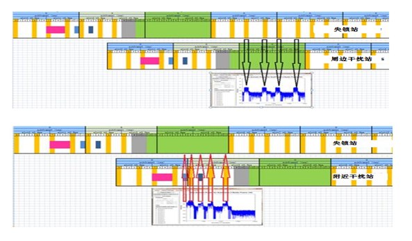 進一步觀察疑似失鎖干擾小區(qū)的反向頻譜圖,能看到都有明顯TDD下行導頻干擾特征,疑似失鎖或配置錯誤造成的TDD干擾。