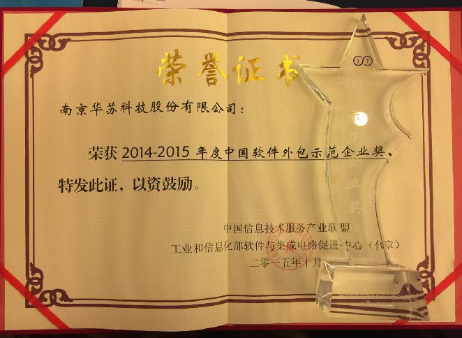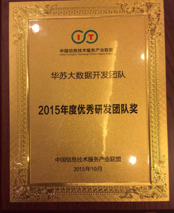 熱烈慶祝華蘇榮獲”2014-2015年度中國軟件外包示范企業獎“,研發大數據團隊榮獲“2015年度優秀研發團隊獎”