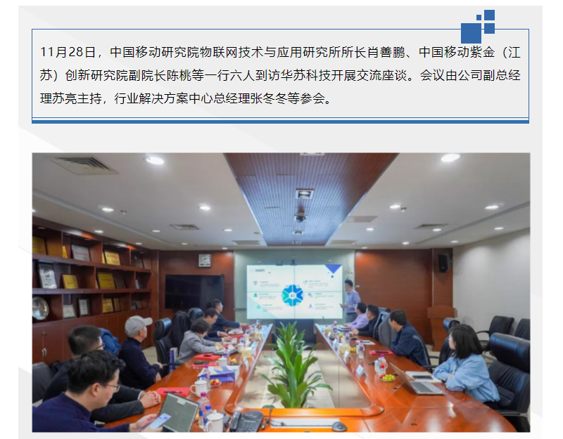 中國移動(dòng)研究院物聯(lián)網(wǎng)技術(shù)與應(yīng)用研究所所長肖善鵬、中國移動(dòng)紫金(江蘇)創(chuàng)新研究院副院長陳桃等一行六人到訪華蘇科技 開展交流座談。