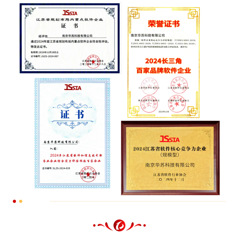 華蘇科技 憑借卓越的技術(shù)實(shí)力、創(chuàng)新能力和市場影響力榮獲“江蘇省規(guī)劃布局內(nèi)重點(diǎn)軟件企業(yè)”、“2024長三角百家品牌軟件企業(yè)”、“2024江蘇省軟件核心競爭力企業(yè)(規(guī)模型)”、“2024年江蘇省軟件和信息技術(shù)服務(wù)業(yè)企業(yè)綜合實(shí)力評(píng)估指數(shù)百家企業(yè)”四項(xiàng)殊榮。